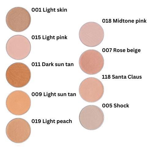 001 light skin complexion valt onder de huidskleuren en is een lichte roze huidskleur die goed te gebruiken is om mensen op toneel mee te schminken zodat je niet gaat glimmen. De kleur op je beeldscherm, telefoon of Ipad kan door de configuratie iets afwijken!