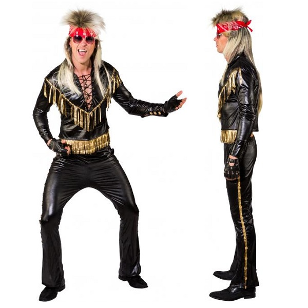 Ken je ze nog? Europe, Motley Crew, Bon Jovi, Guns n Roses, Whitesnake en ga zo maar door. De stoere 80s rockers. Met leren broek en leren jasje, met zo veel mogelijk franjes. Stap in de voetsporen van jouw 80ties held met dit stoere 80ties pak. Gemaakt van imitatie leer en afgewerkt met gouden knopen en franjes. Big hair erop en rock on!