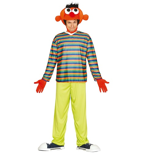 Je kent hem wel, Bert van Bert en Ernie uit Sesamstraat. Dit Bert pak bestaat uit een shirt, broek en masker en is alleen verkrijgbaar in maat Large en valt als een 52/54.