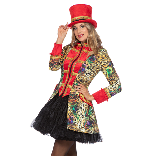 Deze luxe dames carnavalsjas is een echte eyecatcher. De opvallende print met rijke kleuren geeft de jas een extravagante uitstraling, terwijl de contrasterende details en afwerking zorgen voor een chique, circus-achtige look. Perfect voor carnaval, themafeesten of als statement piece op een feest of event. De jas combineert vrouwelijkheid met lef en is ideaal voor wie graag opvalt met stijl.