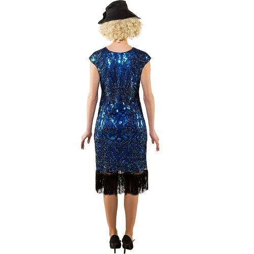 Een prachtige halflange gevoerde Great Gatsby jurk in een diepe blauwe kleur. Deze Peaky Blinders of Roaring 20ties jurk is uniek vanwege zijn kleur en prachtig afgewerkt met blauwe pailletten en zwarte flapper franjes. De rits zit aan de zijkant en is vrijwel onzichtbaar en de jurk is heel licht elastisch. Verkrijgbaar in twee maten.