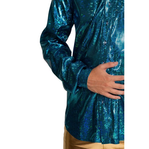 Deze disco blouse gemaakt van turquoise blauwe glitterstof is perfect voor wie wil stralen op de dansvloer. De glanzende stof geeft direct een echte disco vibe en zorgt voor een opvallende glitter & glamour uitstraling. Ideaal voor een discofeest, maar ook helemaal geschikt voor themafeesten, party’s of avonden waar alles mag schitteren. Combineer de blouse met een flared broek of een opvallend jasje en je bent klaar om te shinen.