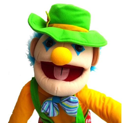 Deze vrolijke clown buikspreekpop is zo’n 70 cm. lang. Grappige blauwe haren en daarover heen een fraaie groene hoed met een gele bloem erop. Leuk geel shirt mét strik, een mooie rode spikkeltjes broek en echte puntige clownsschoenen in dubbele kleuren. Kleren kunnen niet uit, maar je kan er makkelijk eventueel iets anders overheen aan trekken. Maak er je eigen karakter van! Heel makkelijk vanuit de nek bespeelbaar, zelfs voor grote handen en voorzien van een transparante stok aan één van de handjes, zodat je de pop ook heel beweeglijk kan laten overkomen. Echt een toppertje!