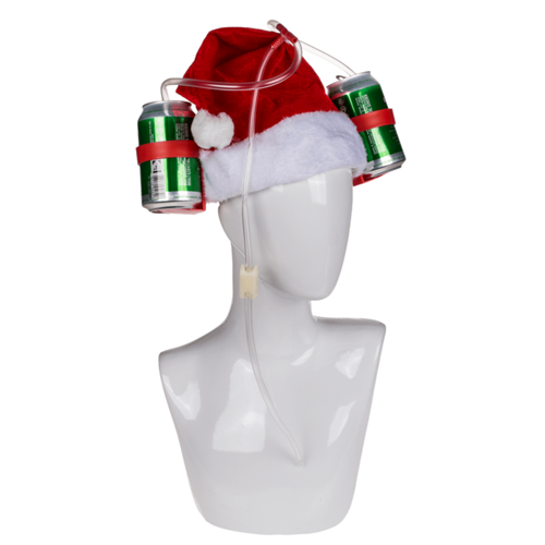 Geinig, een kerstmuts, maar dan in drinkhelm uitvoering. Handig als het buiten te koud is om je biertje vast te houden.