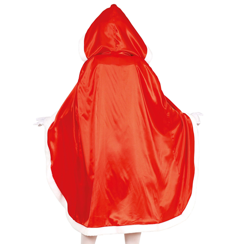 Halflange rode cape met capuchon voor een kerstvrouw. De cape is gemaakt van satijn lijkend materiaal en dus een beetje glimmend. Aan de rand loopt een wit bontrandje. De cape sluit met een klittenbandje.