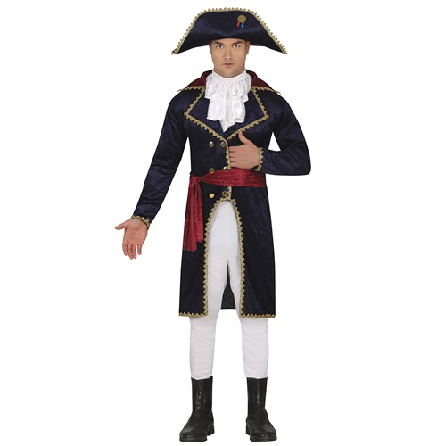 Napoleon Bonaparte kostuum bestaande uit een jas, een broek, een borststuk, een sjerp en een hoed. Verkrijgbaar in twee maten.