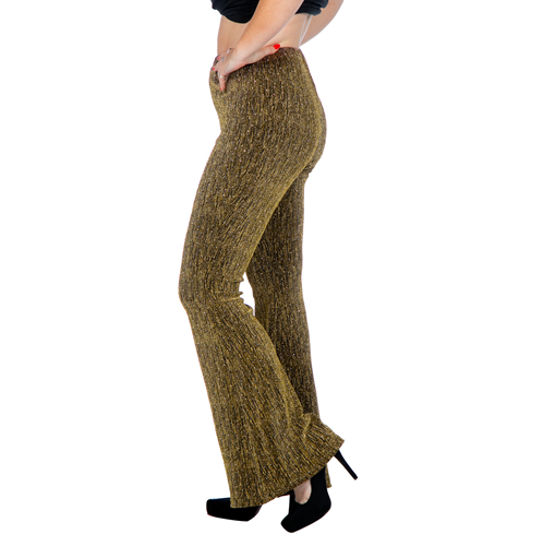Deze elastische broek van goud glitterend lurex is gemaakt om in te stralen. De stof is subtiel beplakt met kleine kristalletjes die bij elke beweging fonkelen. Dankzij de comfortabele stretch en de wijde pijpen heeft de broek een echte disco uitstraling met een moderne twist. Perfect voor festivals, discofeestjes of avonden waarop je outfit mag opvallen. Combineer met een top, blouse of jasje en je bent helemaal klaar om te shinen.