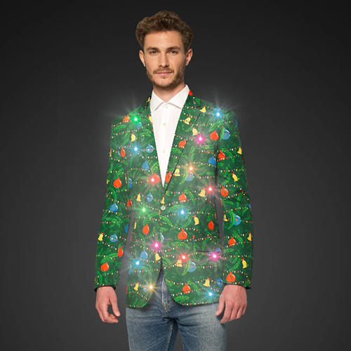 Verander jezelf in een lopende kerstboom met deze te gekke light up blazer met LED lichtjes. Met dit gave Suitmeister colbert kom je helemaal in de sfeer van kerst, sneeuw en gezelligheid met familie/vrienden en breng jij het licht in de donkere dagen! De verlichting werkt op een knoopcel batterij die makkelijk vervangbaar is. Door de batterij-container los te maken kan de jas gewoon gewassen worden.