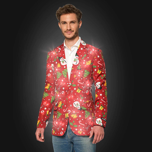Het is winter! Met dit gave Suitmeister colbert kom je helemaal in de sfeer van kerst, sneeuw en gezelligheid met familie/vrienden en breng jij het licht in de donkere dagen! De verlichting werkt op een knoopcel batterij die makkelijk vervangbaar is. Door de batterij-container los te maken kan de jas gewoon gewassen worden.